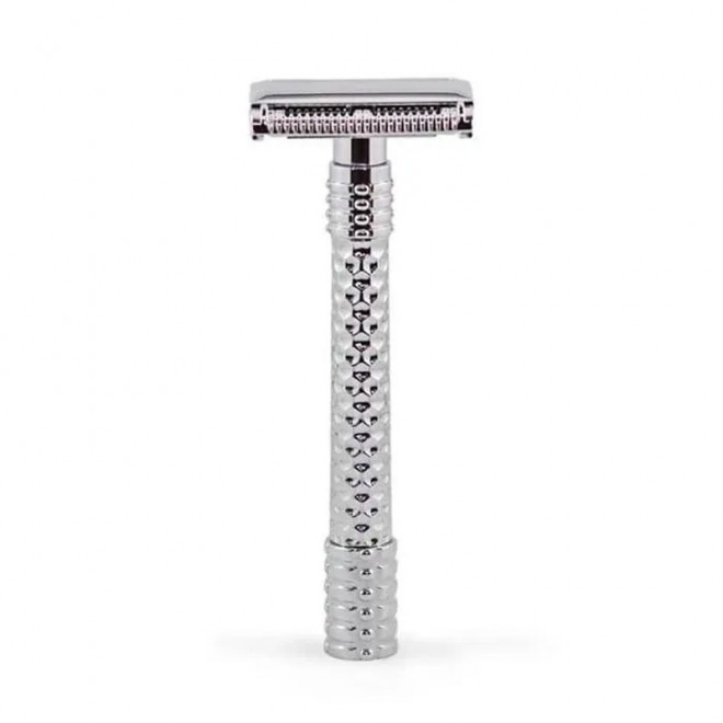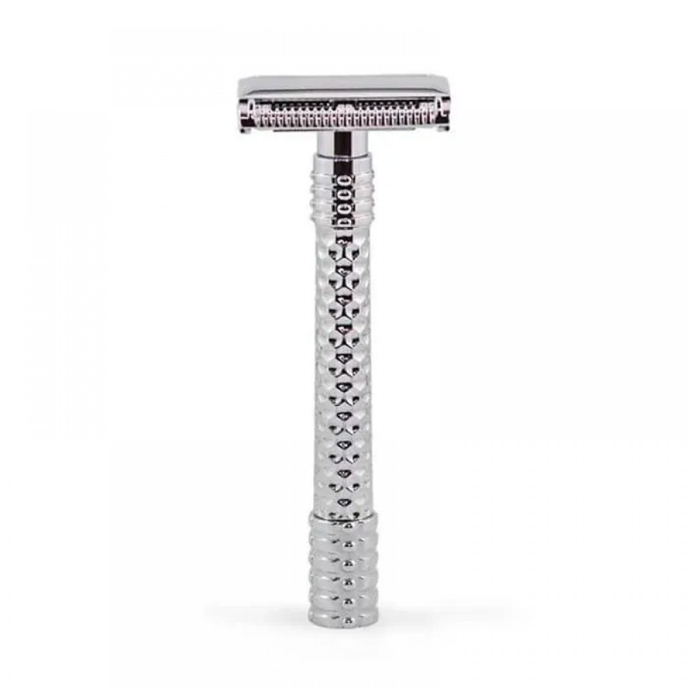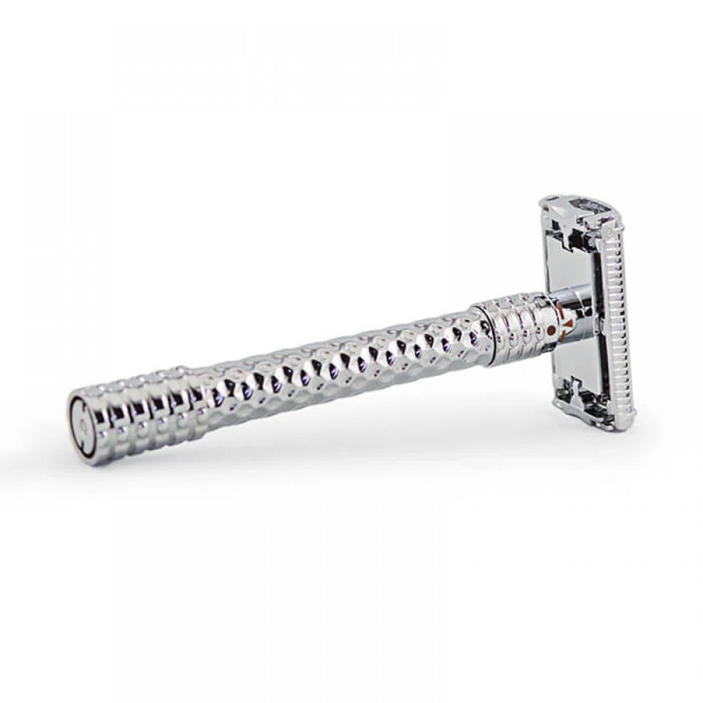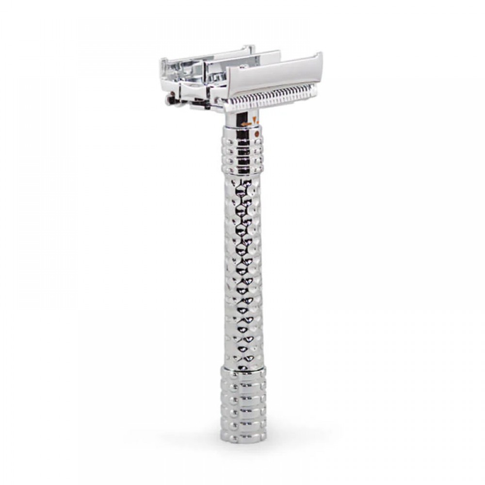 Razorock Adjust Safety Razor to golarka z regulowanym ostrzem, wyposażona w mechanizm otwierania skrzydeł motylkowych.