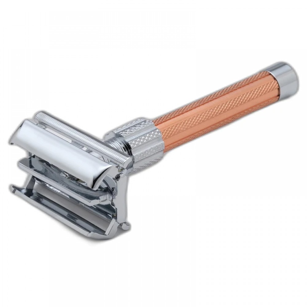 Stylowy uchwyt w kolorze różowe złoto ma teksturowaną i radełkowaną powierzchnię, co nie tylko nadaje maszynce luksusu, ale również zapewnia komfort użytkowania, ponieważ nie wyślizguje się i pewnie leży w dłoni.