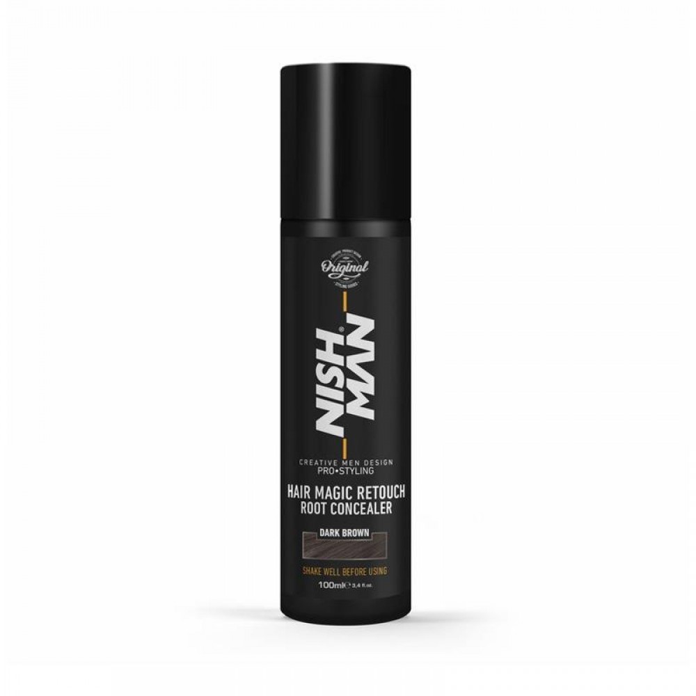 Spray Nishman Hair Magic Retouch Root Concealer — to świetne rozwiązanie do maskowania siwizny. Kosmetyk tureckiego producenta zapewnia szybki efekt i nadaje włosom naturalny ciemno brązowy odcień.
