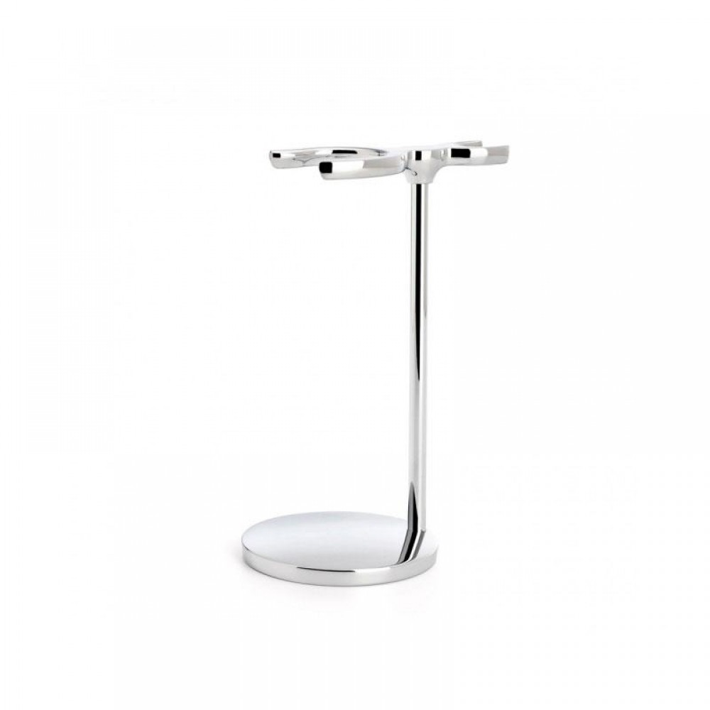 Stojak na pędzel i maszynkę do golenia Mühle. Do stojaka pasuje większości standardowych pędzli i maszynek do golenia. Wykonany z chromu, więc jest odporny na wilgoć.