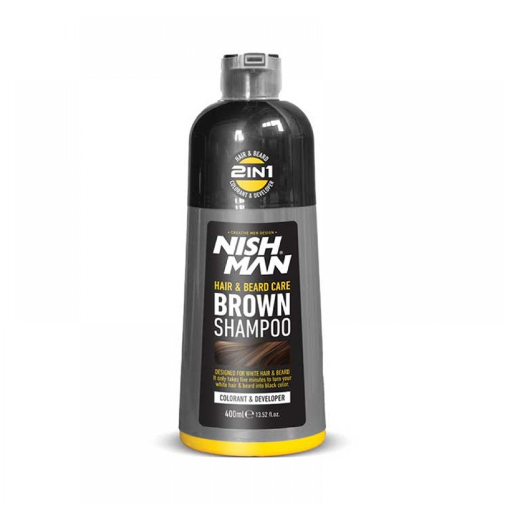 Szampon koloryzujący do włosów i brody Nishman Hair & Beard Brown Shampoo maskuje siwe włosy. Szampon łączy w sobie farbę i wywoływacz (dwa w jednym). Pomaga farbować włosy na brązowo w zaledwie 5 minut. Dzięki specjalnej formule włosy stają się brązowe. Szampon Nishman Hair & Beard Brown Shampoo również odżywia, chroni i przywraca kolor włosów. Produkt jest odpowiedni dla wszystkich rodzajów włosów.